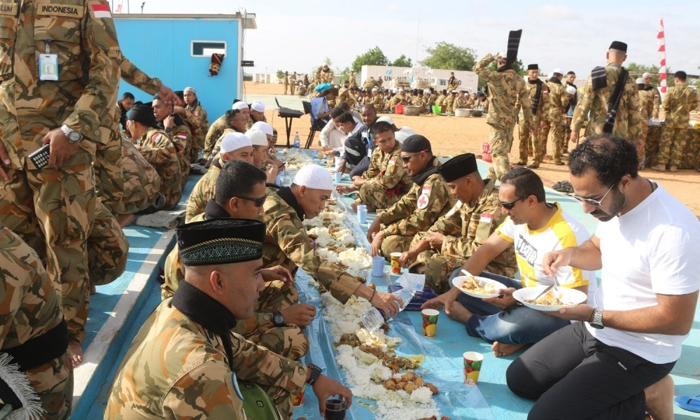 Pasukan Garuda TNI yang tergabung dalam Satgas Batalyon Komposit Konga XXXV-B/Unamid (United Nations Mission In Darfur) atau Indonesian Battalion (Indobatt) dibawah pimpinan Letkol Inf Singgih Pambudi Arinto, S.IP. sebagaiKomandan Satgas, usai pelaksanaan Sholat Idul Fitri 1437 H menggelar acara makan bersama, di Lapangan Markas Indobatt-02, Supercamp, El-Geneina, Darfur Barat, Rabu (6/7/2016).